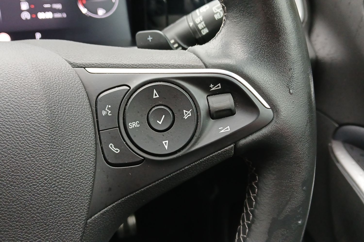 • Steering Wheel - Three-Spoke Design - Leather Covered - Satin Chrome-Effect Bezel