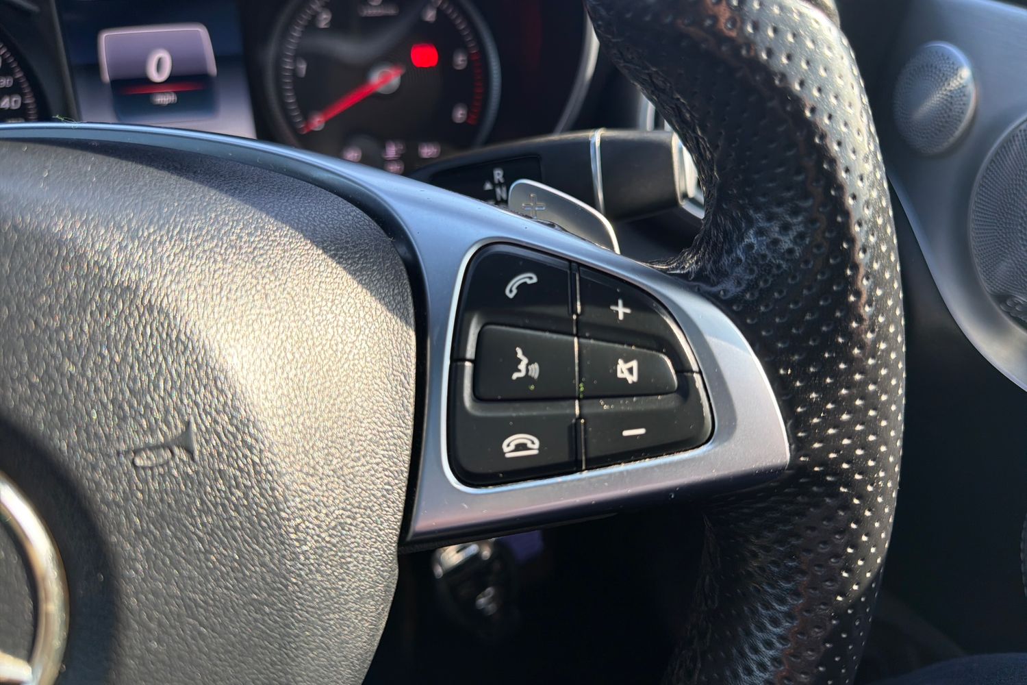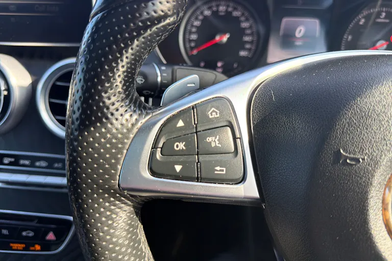 • Steering Wheel - 3-Spoke Multi-Function AMG in Leather with Flattened Bottom Section - Chrome Inserts and Perforated Leather in Grip Area